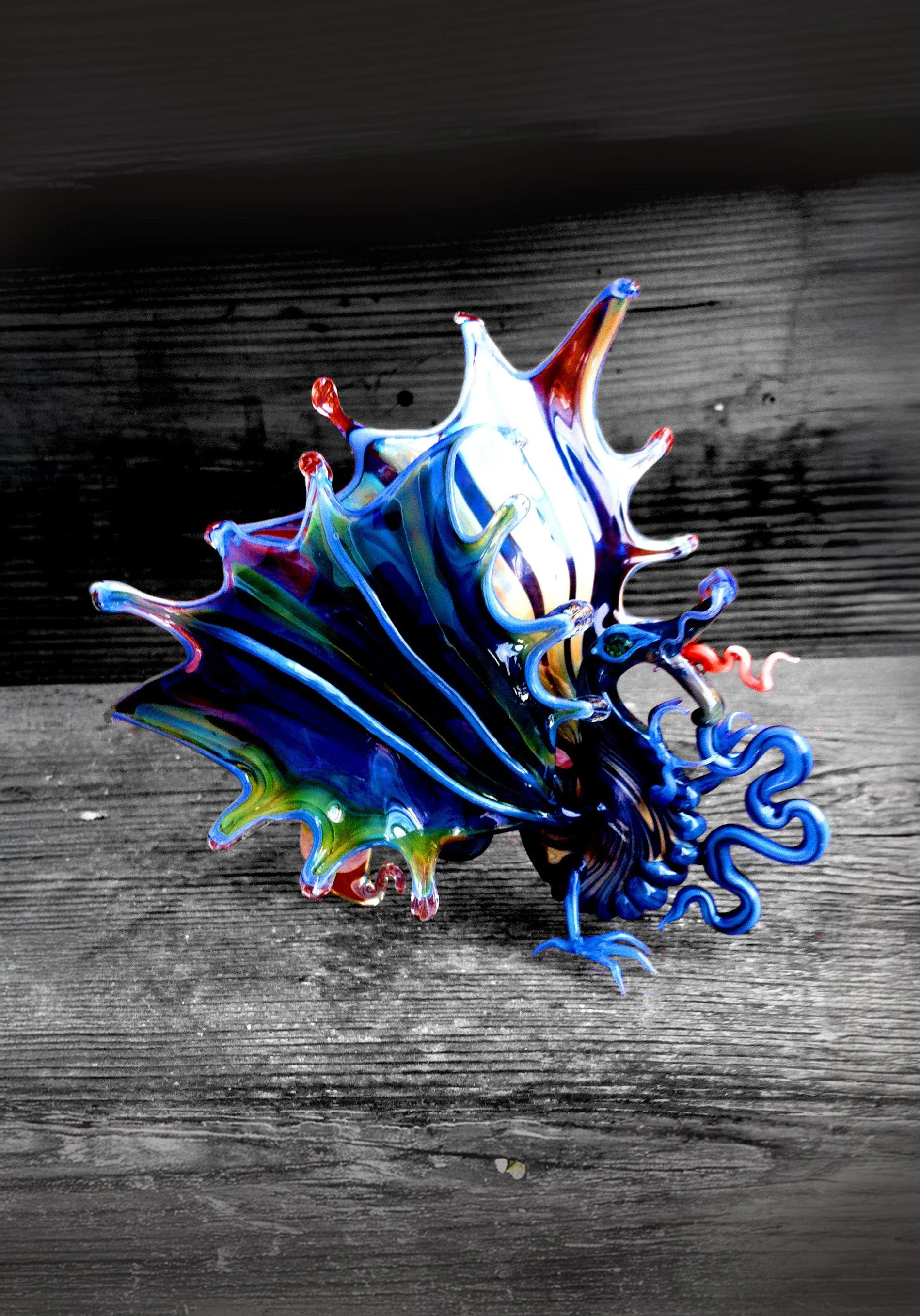Flameworked borosilicate glass. Sandblasted and acid etched mounted on stone plinth